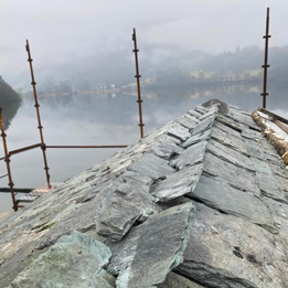 A new wrestler ridge on a rebuilt stone boathouse on the shore of Grasmere.