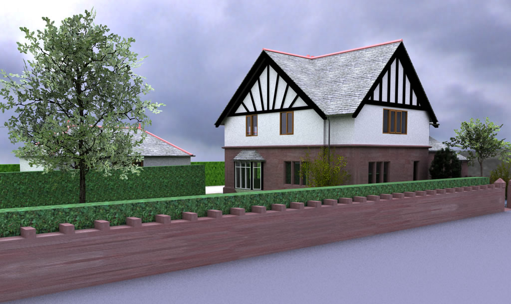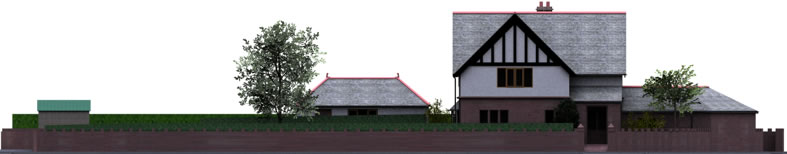 I tried some rendered elevations in Cinema 4D as it conveyed the slope of the garage roof rather better than the simple 2D elevation which made the garage appear very high